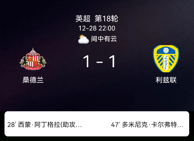 北京时间12月28日22:00,2025-2026赛季英格兰足球超级联赛第18轮,桑德兰主场对阵利兹联。第28分钟阿丁格拉破门,1-0;第47分钟卡尔弗特-勒温扳平,1-1;第61分钟休姆领黄;全场1黄、无红牌。最终比分,桑德兰1-1利兹联。