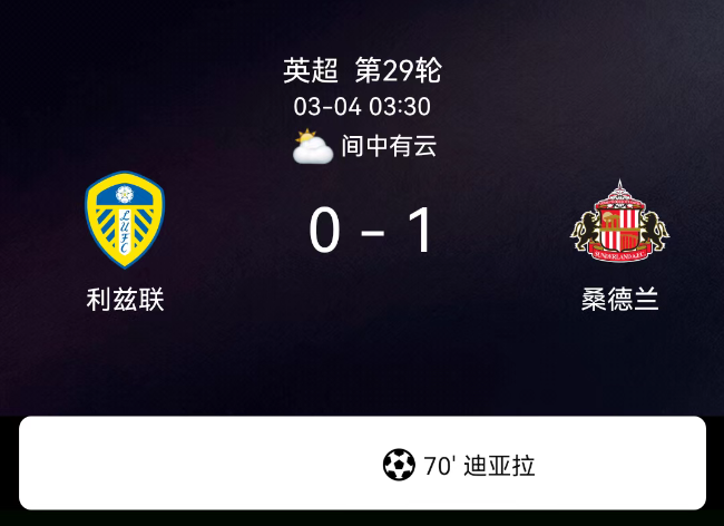 北京时间3月4日英超第29轮,利兹联对阵桑德兰。第69分钟迪亚拉点射0-1;双方无红黄牌。最终比分,利兹联0-1桑德兰。