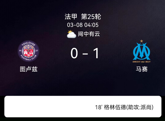 18分钟:派尚倒三角传球,格林伍德劲射破门,马赛1-0图卢兹